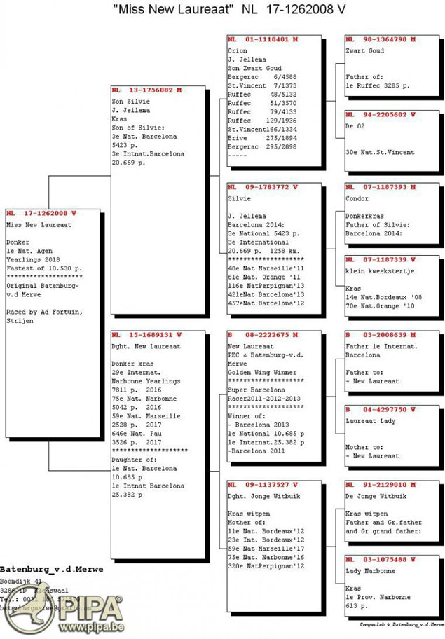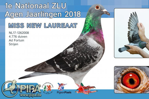 入賞阿讓國際賽荷蘭全國 (一歲鴿組 11.572羽)冠軍為愛迪.佛頓(Fortuin Ad)鴿舍,該舍冠軍鴿NL17-1262008班母,是在比利時時間6月30日(星期六)早上06時05分:50秒歸巢,翔距911.736公里,創下平均分速948.9米/分,此鴿同時也是荷蘭全國參賽阿讓國際賽交鴿總數10.530羽的總冠軍鴿。
