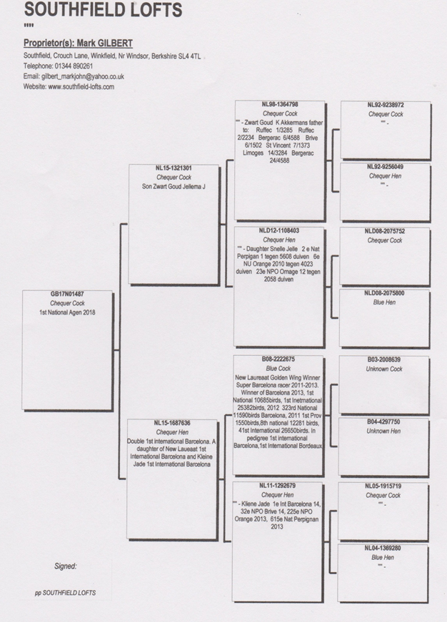 阿讓國際賽英國全國678羽冠軍(國際24.850羽)為馬克.吉伯特(Gilbert Mark)鴿舍,該舍冠軍鴿GB17-N01487斑公是在比利時時間6月30日(星期六)早上7時45分32秒歸巢,翔距849.689公里,創下平均分速801.19米/分,屬新榮耀號直孫。