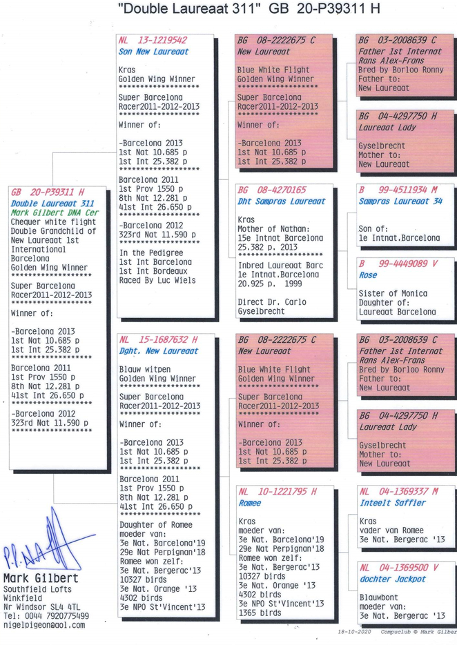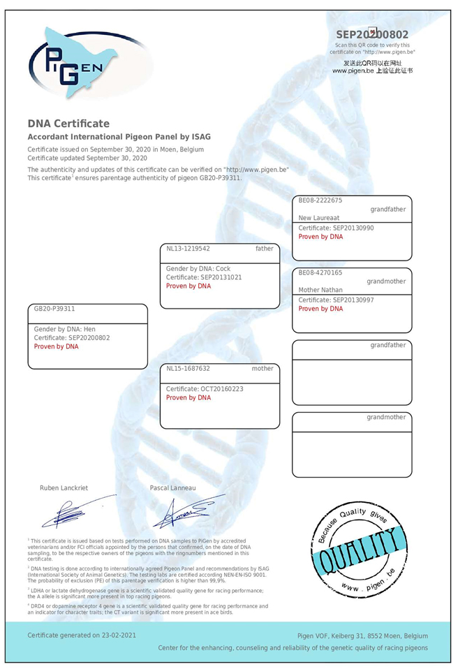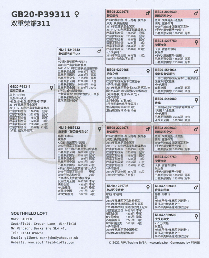 2020年開創者歐洲鴿王冠軍(“新榮耀號”孫代)。