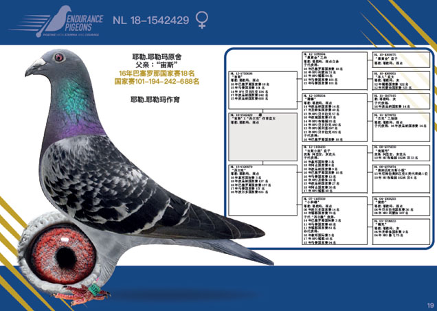 外祖母鴿:NL15-1320979斑.母 “希爾克號” ,2020年巴塞隆納國際14.589羽亞軍。