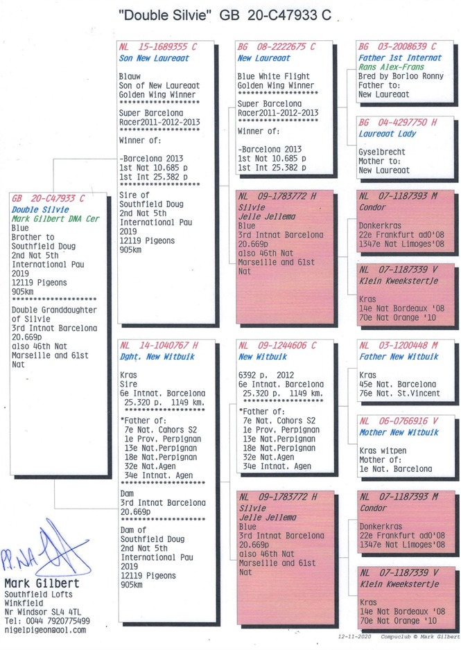 馬克.吉伯特(Gilbert Mark)鴿舍,這回波城國際賽可謂是創造新記錄,計入賞英國全國前8位佳績(1.2.3.4.5.6.7.8.),國際賽12.119羽入賞4位、5位、7位,而且該舍前3羽選手鴿是當日晚上歸返。反觀國際賽前3名(冠.亞.季軍)由空中距離較遠的荷蘭鴿友包辦,不過皆是隔日早上才返舍。