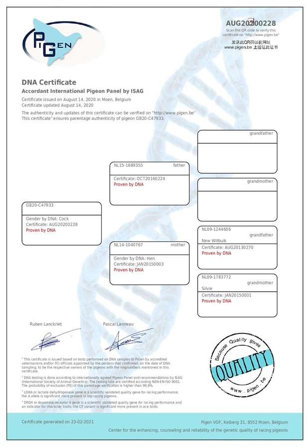 “絲薇近親933” GB20-C47933 灰公 D.N.A.檢驗證明書