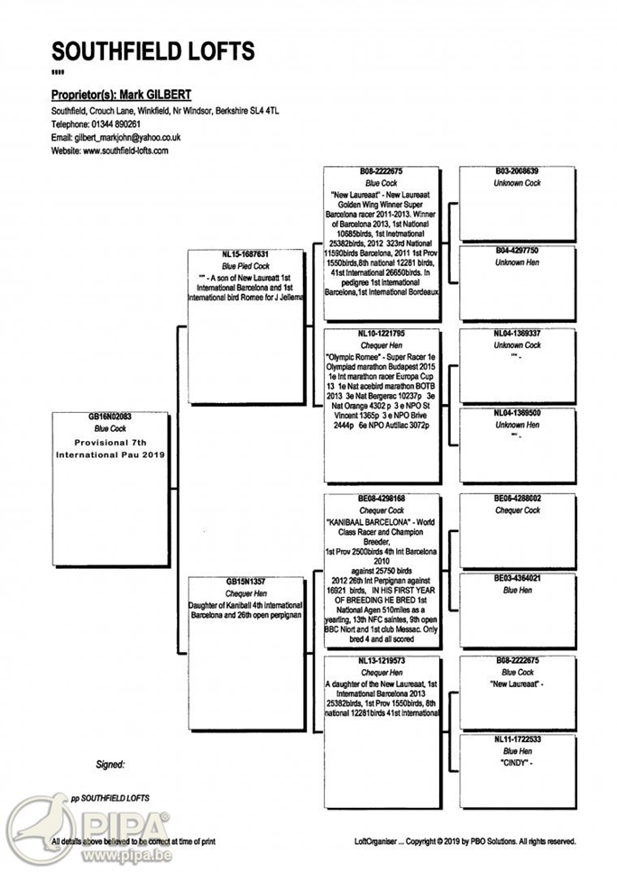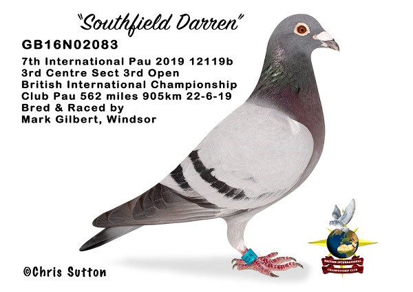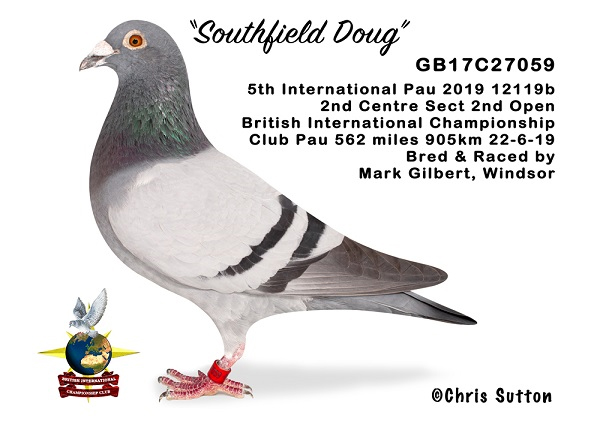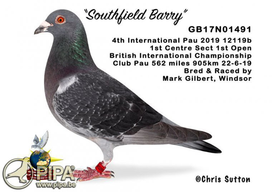 獲得2019年波城英國全國冠軍為馬克.吉伯特(Gilbert Mark)鴿舍,該舍冠軍鴿GB17-N01491斑公是在比利時時間6月22日(星期六)當日晚上22時06分59秒歸巢,翔距905.163公里,創下平均分速1087.96米/分,獲得英國全國冠軍,國際賽12.119羽4位,接著第二羽GB17-C27059灰公(新榮耀直孫)到達是22時18分14秒獲得全國亞軍,國際賽12.119羽5位,第三羽GB16-N02083灰公(新榮耀直孫)到達是22時22分16秒獲得全國季軍,國際賽12.119羽7位。