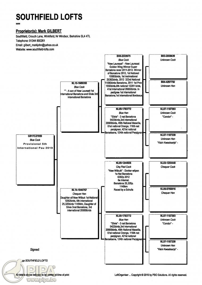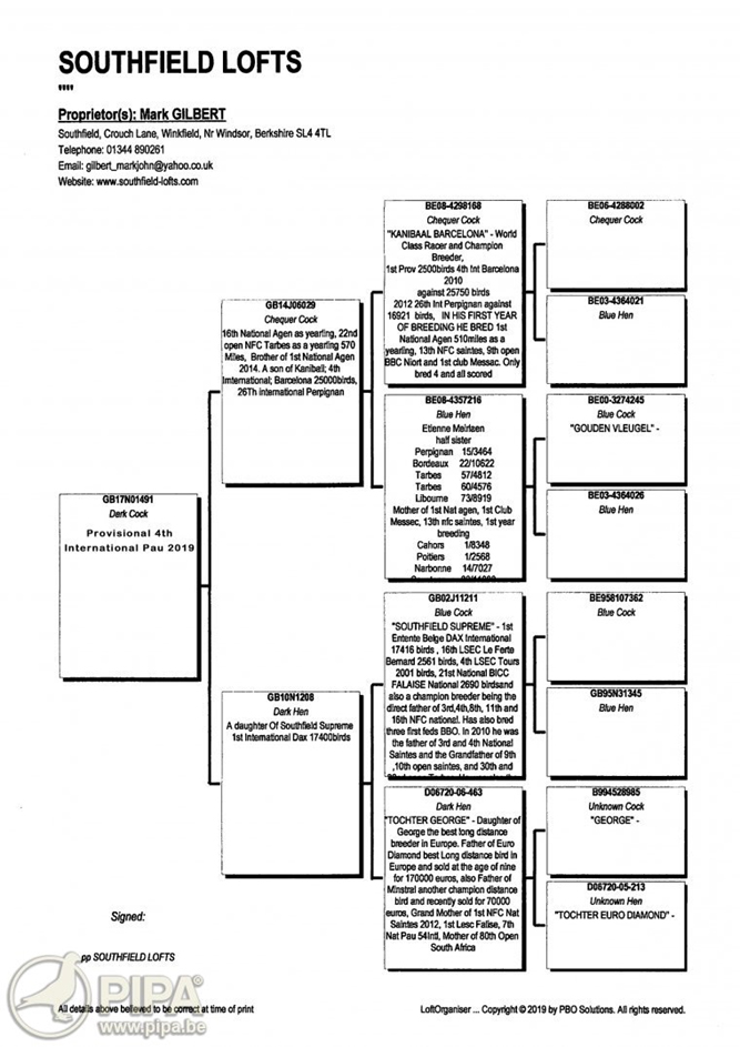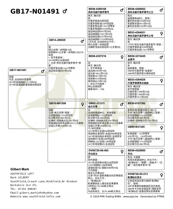 2019年波城英國全國冠軍鴿GB17-N01491斑公(國際12.119羽4位)中文翻譯血統書