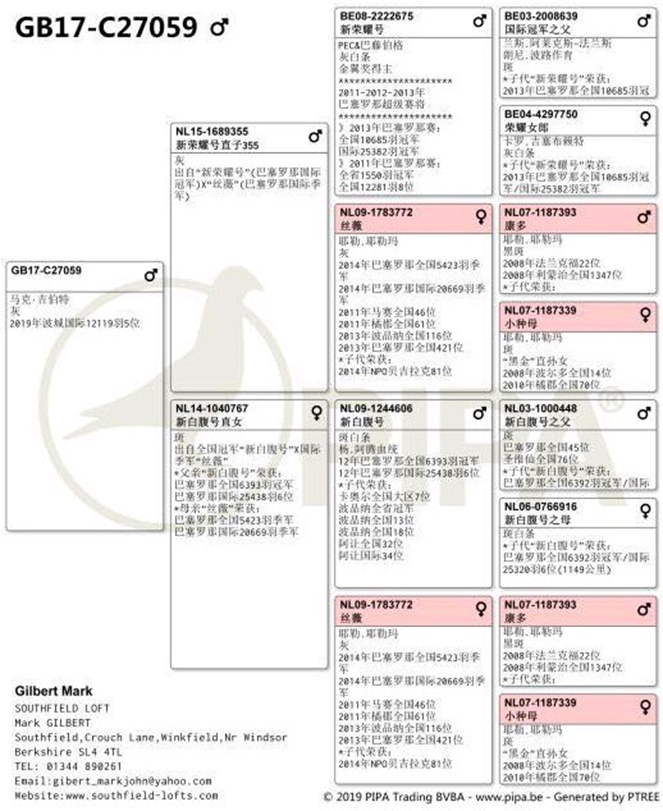 2019年波城英國全國亞軍(國際12.119羽5位)鴿GB17-C27059 灰公血統書(新榮耀號直孫)