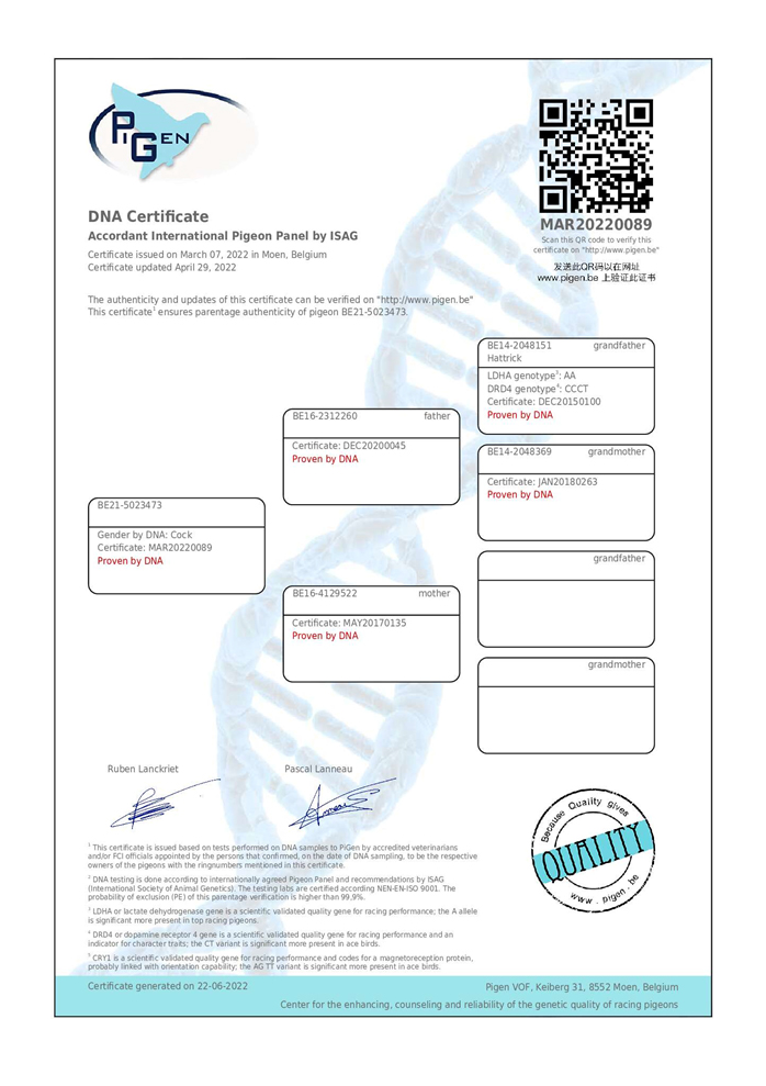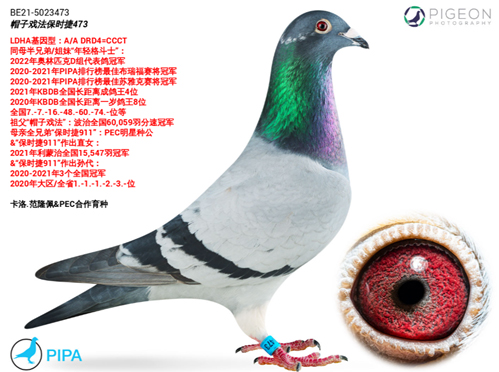 LDHA基因型:罕見A/A DRD4=CCCT ,頂級獨有!波治全國14,449羽冠軍