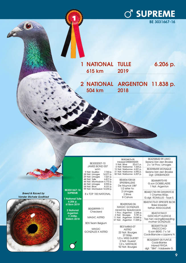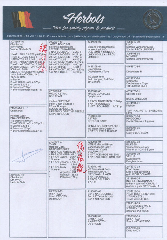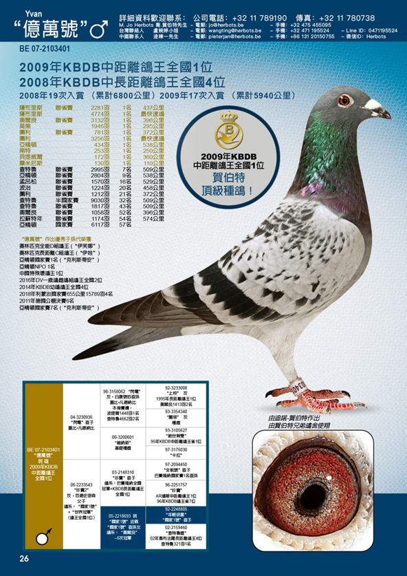 外祖父鴿:億萬號B07-2103401斑公,本身入賞:2009年比利時K.B.D.B.中距離全國鴿王1位。