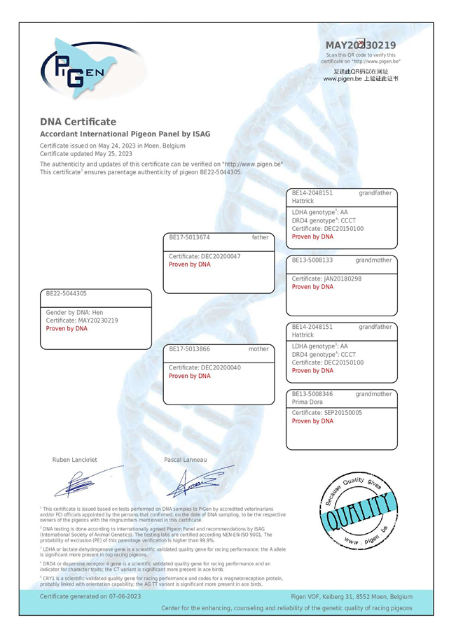 2022年4場長距離賽比利時最佳一歲鴿亞軍