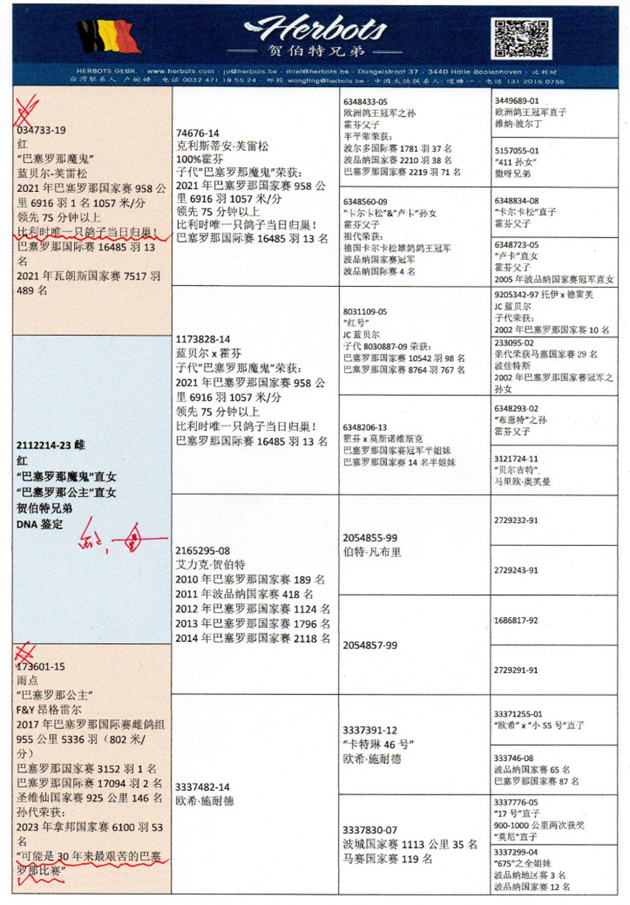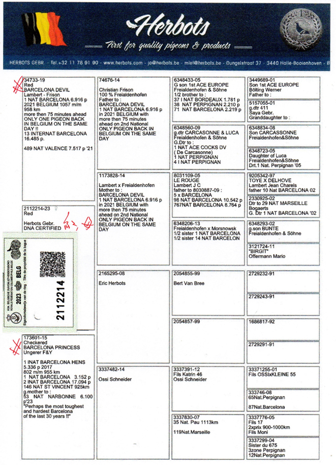![]() 鴿舍連絡人:黃慶勳 電話:0922-591037 03-8562.665 “巴賽隆納公主214” B23-2112214紅母 DNA 驗證 父親:FR34733-19 “巴賽隆納魔鬼”, 放飛當天比利時唯一的一羽歸返鴿! 2021年巴賽隆納國家賽比利時6.916羽1名 ,1057 米/分 958 公里。 母親: FR173601-15 “巴賽隆納公主”,2017年巴賽隆納國際賽雌鴿組 5.366 羽1名,955 公里 分速802米/分,巴賽隆納國際賽 17.094羽2名。"也許是過去30年來最艱苦、最困難的巴賽隆納賽 !!" 孫代榮獲:2023年巴賽隆納國家賽6.100羽53名。