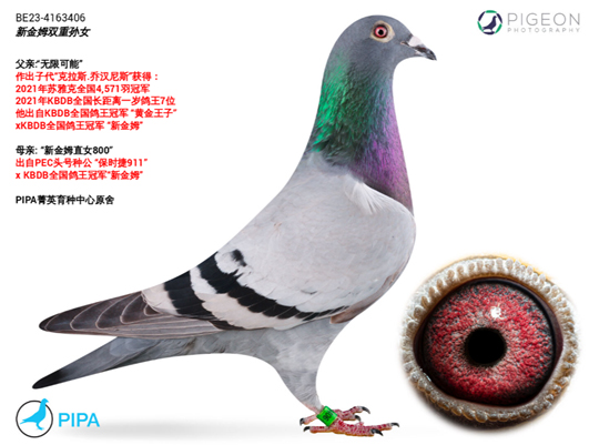 ●母鴿:BE20-4157800 “新金姆直女800”,出自超級血系配對“保時捷911”X“新金姆”