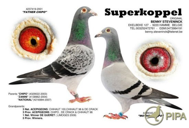 母鴿:“夢想曲”B14-4059884灰母,2014年比利時杜爾斯國家賽交鴿總數28.044羽總冠軍。