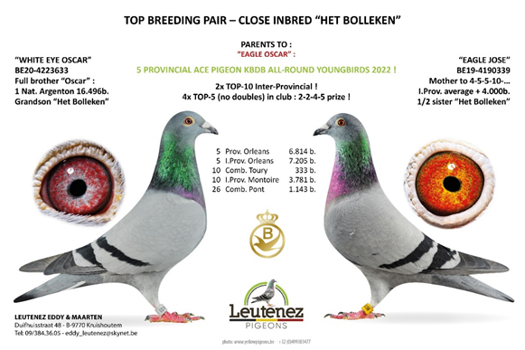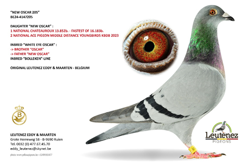 “奧斯卡號B18-4034402灰公”, 2018年比利時亞精頓19.818羽總冠軍。全弟”白眼奧斯卡號B20-4223633灰公”作出2023年查特盧斯II全國16.537羽總冠軍及比利時幼鴿組大中距離KBDB全國鴿王亞軍。( B23-4180041灰公”新奧斯卡” )。