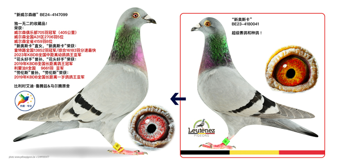 父鴿:”新奧斯卡B23-4180041灰公”獲得2023年查特盧斯II全國16.537羽總冠軍及比利時幼鴿組大中距離KBDB全國鴿王亞軍。