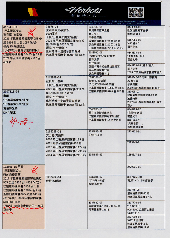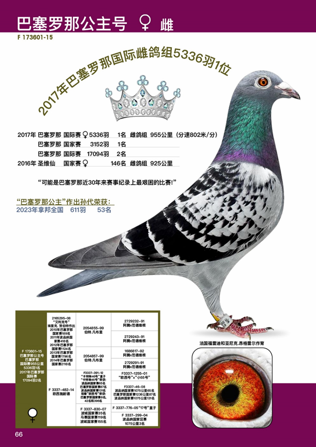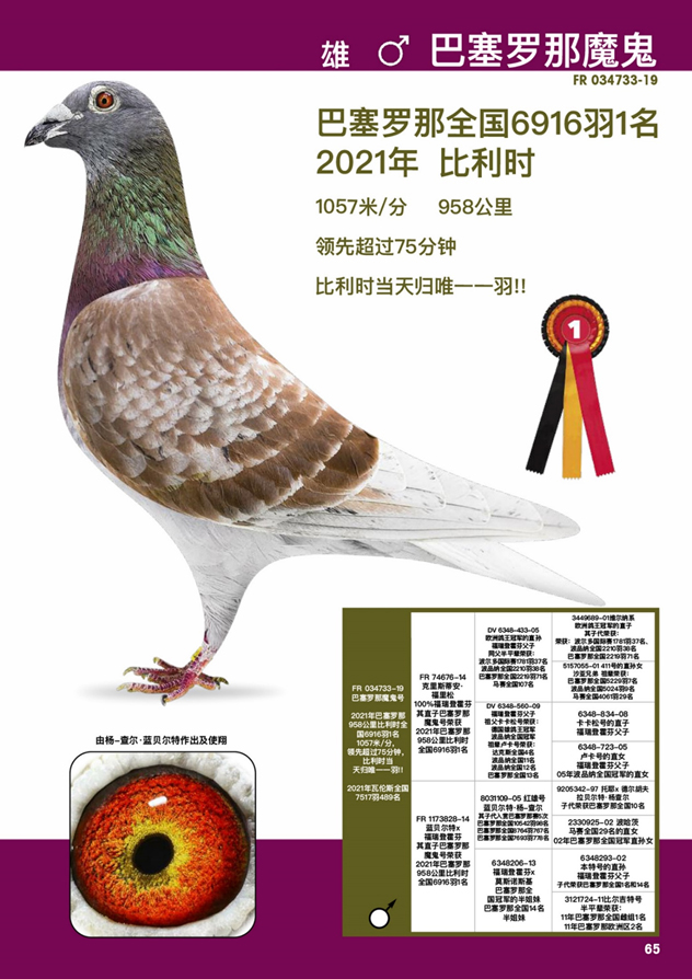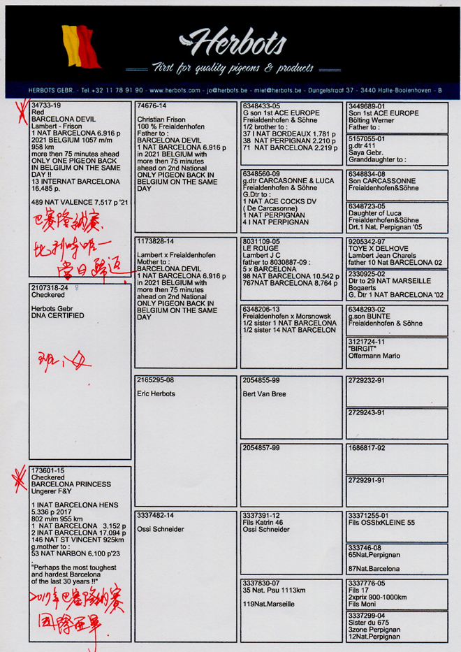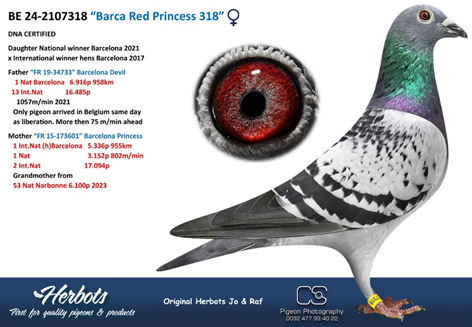 ![]() 鴿舍連絡人:黃慶勳 電話:0922-591037 03-8562.665 “巴賽隆納公主318” B24-2107318 斑 母 DNA 驗證: 父親:FR34733-19 “巴賽隆納魔鬼”, 2021年巴賽隆納國家賽,放飛當天比利時唯一的一羽當日歸返鴿! 比利時6.916羽1名 ,1057 米/分 958 公里。 母親: FR173601-15 “巴賽隆納公主號”,2017年巴賽隆納國際賽雌鴿組 5.366 羽1名,955 公里 分速802米/分,巴賽隆納國際賽 17.094羽2名。"也許是過去30年來最艱苦、最困難的巴賽隆納賽 !!"