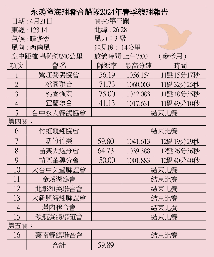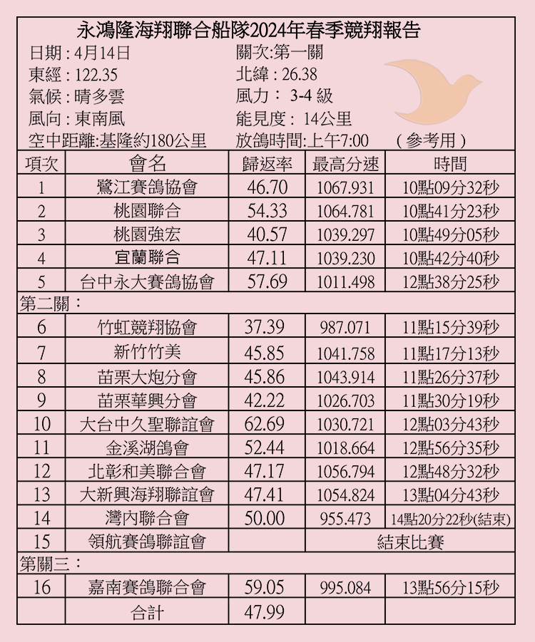 2024年永鴻隆聯合船隊春季比賽各關歸返率一覽表