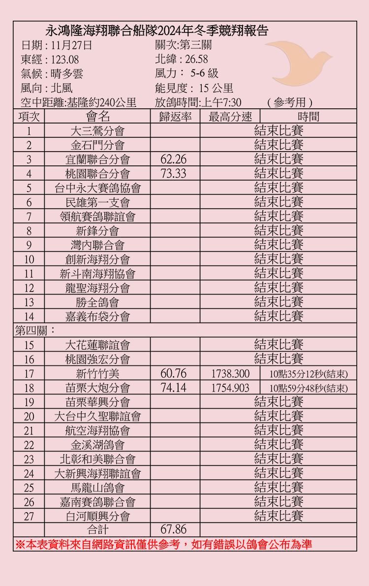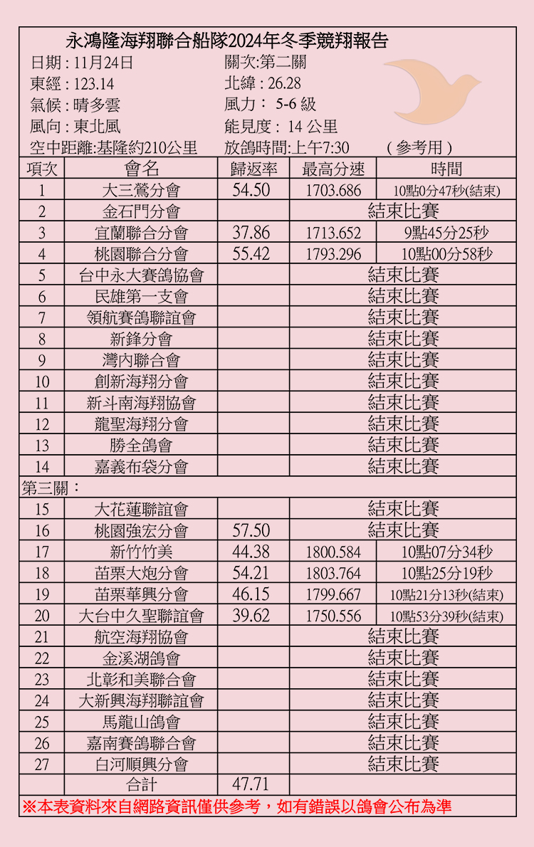 2024年永鴻隆聯合船隊冬季比賽各關歸返率一覽表