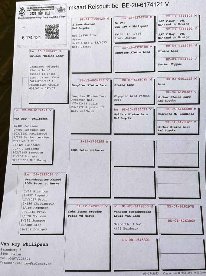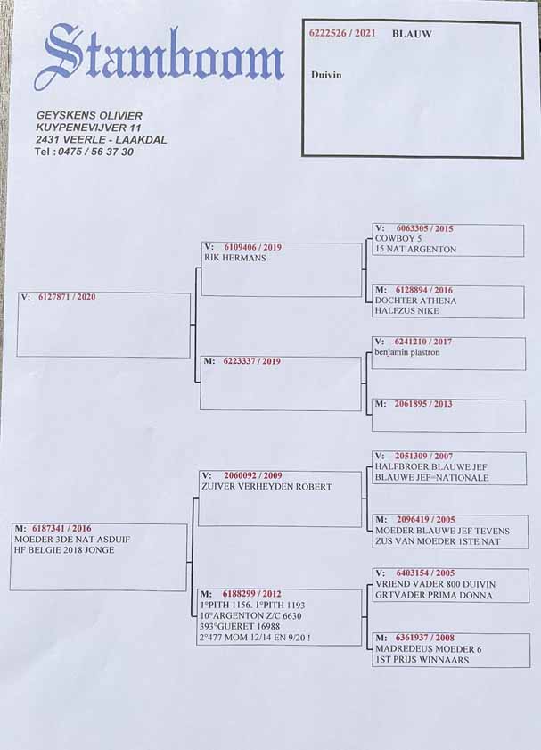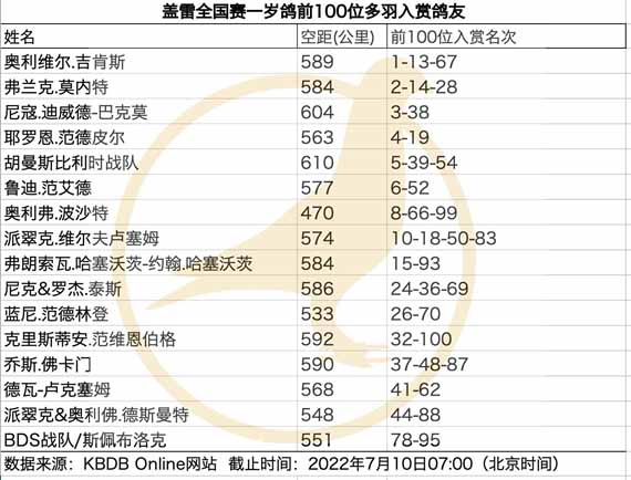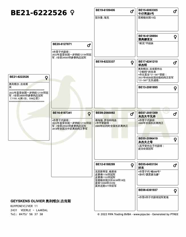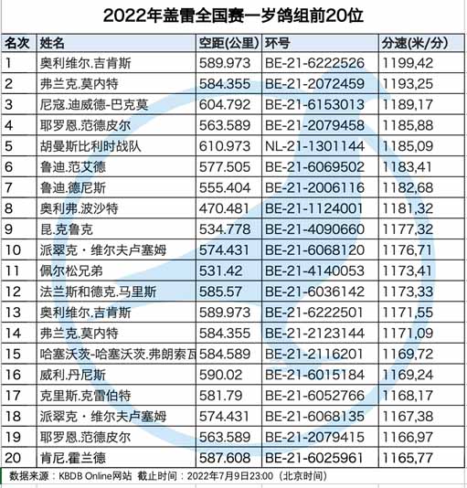 報導:          獲得比利時蓋雷全國(一歲鴿12.194羽)冠軍為奧利維爾.吉肯斯(Geyskens Olivier)_鴿舍,該舍冠軍鴿B21-6222526灰母是在7月9日(星期六)下午15時21分完成打鐘,空中距離為589.973公里,平均分速為1199.42 米/分,同時也是集鴿總數20.569羽總冠軍鴿。