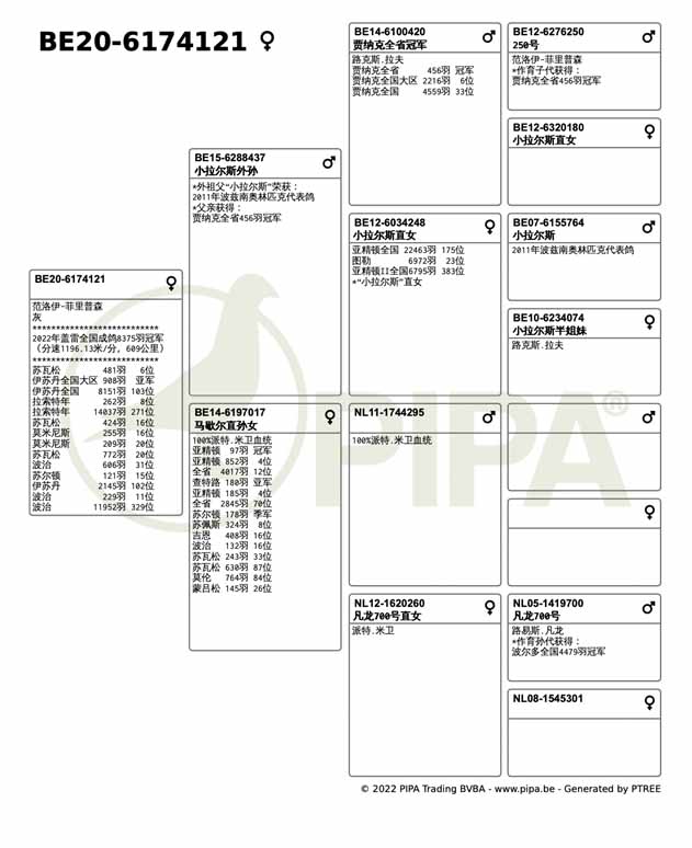 蓋雷成鴿8.375羽冠軍 比利時成鴿8.375羽全國冠軍是範洛伊-菲里普森( 範洛伊-菲里普森)-鴿舍,該舍冠軍鴿B20-6174121灰母,7月9日(星期六)下午15時39分完成打鐘,空中距離為609.111公里,,平均分速為1196.13 米/分。