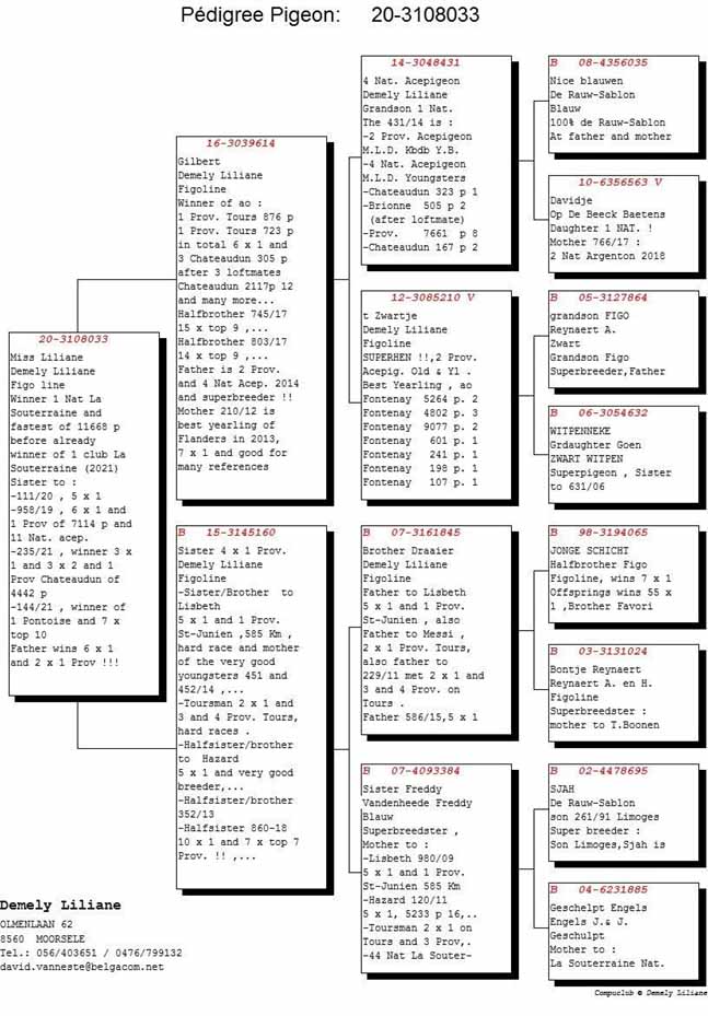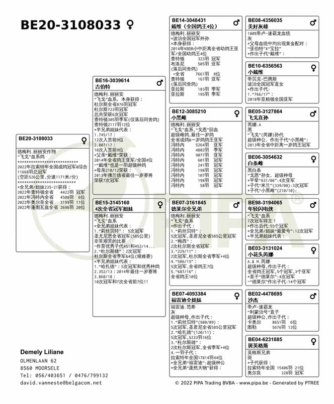 獲得比利時拉斯特年(La Souterraine )全國成鴿組4.907羽冠軍為麗麗安.德梅利(Demely Liliane)鴿舍,該舍冠軍鴿B20-3108033灰母在7月15日(星期五)下午14時29分完成打鐘,空中距離為526.432公里,平均分速為1171.80米/分,此鴿同時也是拉斯特年交鴿總數11.668羽的總冠軍鴿。