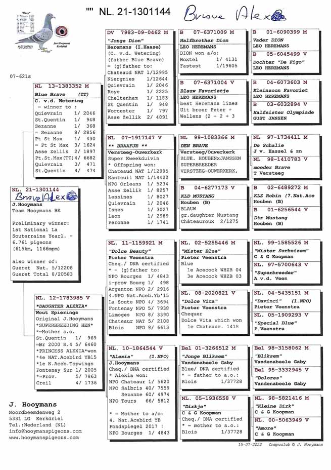 比利時拉斯特年一歲鴿6.761羽全國冠軍是楊.胡曼斯團隊(Team Hooymans),冠軍鴿B21-1301144灰公在7月15日(星期五)下午15時47分完成打鐘,空中距離為615.358公里,平均分速為1166.56 米/分。