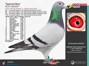 2021年胡曼斯荷蘭戰隊的奇跡賽鴿“特殊男孩”儘管已經5歲,仍然取得了世界級優異成績。在他參賽的最後一年內,他獲得伊蘇丹全國14.785羽亞軍、NPO查特路2.863羽8位、NPO莫倫5.644羽16位和亞瑟澤裡克10.863羽17位。他憑藉這些成績獲得奧林匹克全能4位。他25次入賞前1%,沒有重複!“特殊男孩”獲得12項平均5000羽前10位。他參加了從短距離、中距離到長距離的全部級別比賽。真正的全能賽將,獲得6次電訊賽入賞,取得NPO前10位,一羽夢想賽鴿!他與NL14-1208806配對,作育子代“布蘭達”(Brenda)獲得KBDB亞精頓全國4萬多羽冠軍,他無疑是未來的超級戰將作育者…