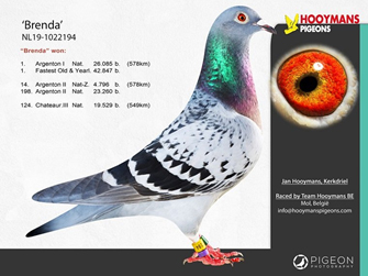 超級賽鴿“西爾維”將被轉入種鴿舍。這羽身體緊湊的賽鴿以鴿舍經理西爾維.格洛迪亞努的名字來命名的,他與蜜雪兒.德派珀(Michel de Pijper)一起負責管理賽鴿戰隊。“西爾維”作為一歲鴿在胡曼斯鴿舍獲得北方聯盟查特頓15.359羽冠軍。2021年他取得2項NPO賽前10位:查特路全國8.000多羽5位和NPO威爾森2.363羽6位。憑藉這些成績,他獲得NPO全國長距離鴿王12位。他的配對鴿出自“新哈利”X“阿莉西亞”(“哈利”全姐妹)。最近她作育子代獲得KBDB亞精頓全國大區一歲鴿5位(全國21282羽13位)。成功公式的另外一個實例,“新哈利”X“哈利姐妹”…