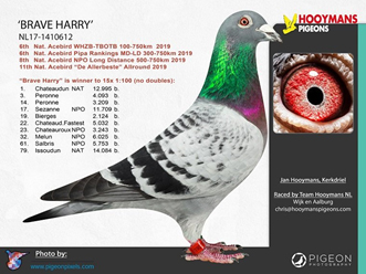 胡曼斯荷蘭戰隊的另外一羽神奇戰將是“勇敢哈利”,他僅僅參賽2年,卻贏得了15項前1%入賞(沒有重複)。他的比賽生涯最後一戰取得了頂級成績:查特頓全國10.082羽冠軍。現在他與“愛麗達”(Alyda)的姐妹組成育種配對,出自“美好帥哥”(Dolce Beauty)X“阿莉西婭”(Alexia)。母親“愛麗達姐妹”作育多羽優秀子代,全姐妹“愛麗達”獲得NPO波治冠軍,另外一羽全姐妹“阿莉西婭直女12/985”(Dochter Alexia 12/985)是沃特.史碧林(Wout Spiering)的基礎種雌,作育孫代“黃金王子”(Golden Prince)獲得NPO查特路冠軍、NPO查特路季軍、NPO拉索特年10位,曾孫代“新王子”(New Prince)獲得拉索特年全國冠軍、NPO伊蘇丹季軍、NPO查特路4位。