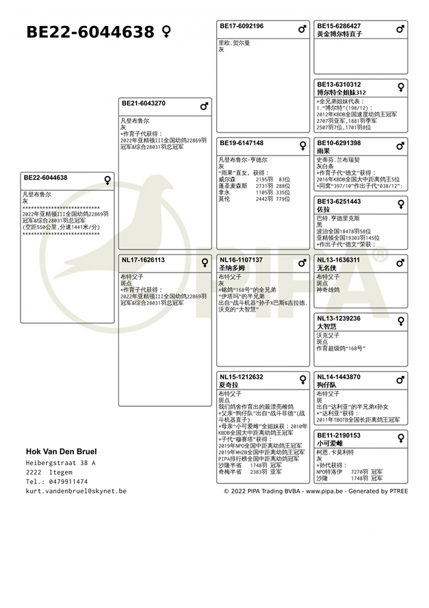 獲得比利時亞精頓 III全國幼鴿組22.865羽冠軍為凡登布魯爾(Hok Van Den Bruel)鴿舍,該舍冠軍鴿B22-6044638灰母是在8月21日(星期日)中午14時22分完成打鐘,空距為550.789公里,平均分速為1441.54米/分,此鴿同時也是交鴿總數28.031羽總冠軍鴿。