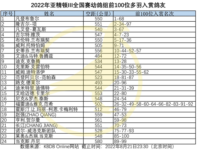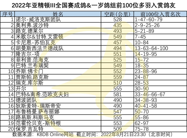 亞精頓 III全國幼鴿組22.865羽冠軍