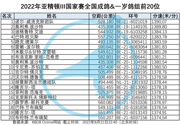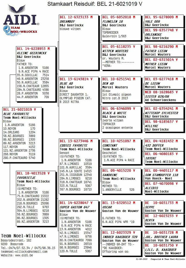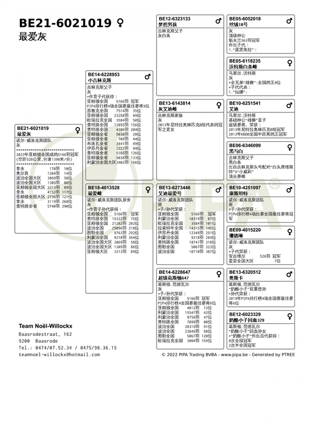 獲得比利時成鴿5.166羽全國冠軍-諾爾-威洛克斯戰隊(Team Noel-Willockx),該舍冠軍鴿B20-在8月21日(星期日)中午14時19分完成打鐘,空距為528.18公里,平均分速為1390.07米/分。