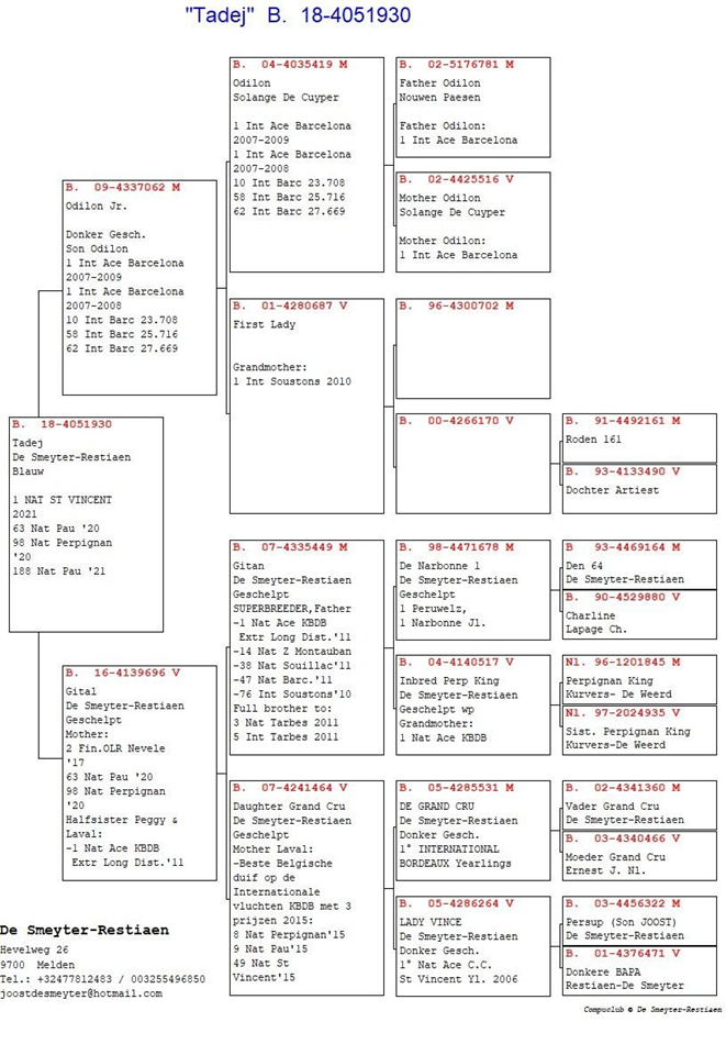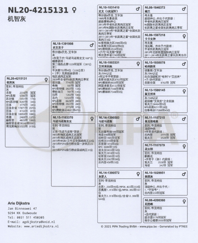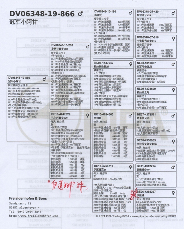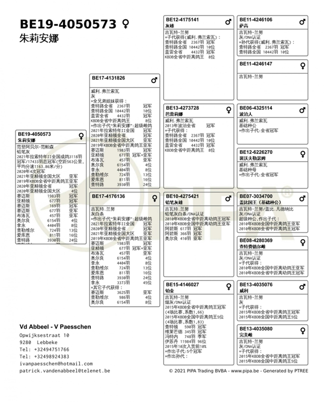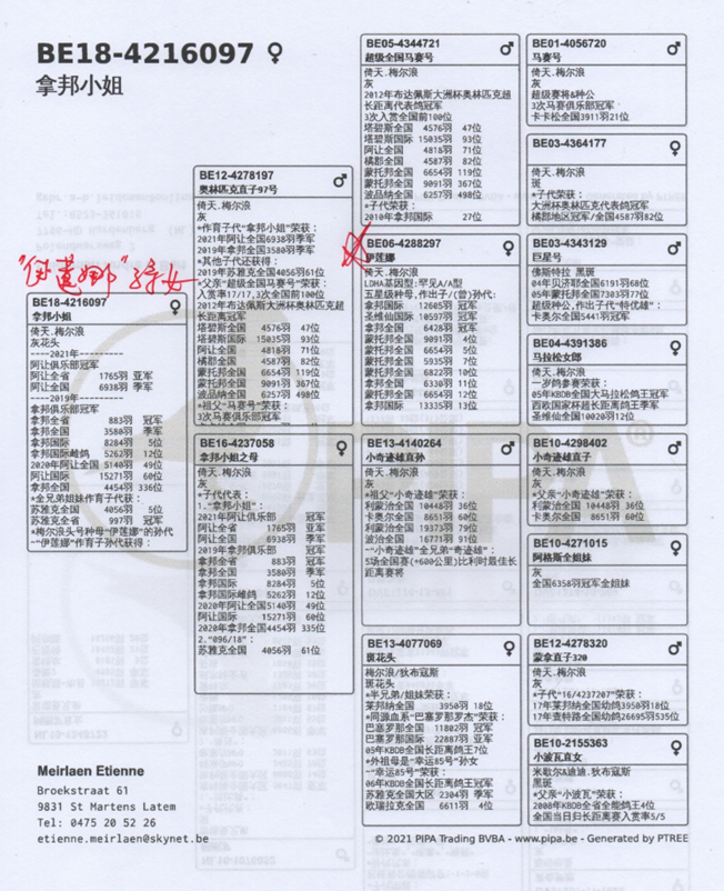 獲得2021年阿讓國際雌鴿7.622羽冠軍“拿邦小姐”(Miss Narbonne BE18-4216097灰母)獲得拿邦全省冠軍和全國一歲鴿季軍。她是黃金種雌“伊蓮娜BE06-4288297灰母”的直孫女。