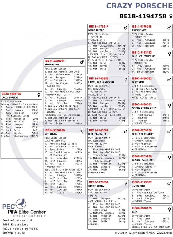 回顧比利時賽鴿運動歷史,有些賽鴿已成為一代傳奇並留下了自己的印記。如果從二戰以後算起的話,或者更為接近現在的視角來說,我們可以列舉出迪沃斯的“小迪迪”(Kleine Didi)、布魯維爾(Bruwier)的 “特立獨行”號(L'exceptionnel)、赫博瑞的“愛克”(Ike)還有佛斯豪特的“阿曼多”。雖然“阿曼多”的關注度更多得以驚人的價格而獲得,但是我們不可忘記他可能是比利時賽鴿運動歷史上最優秀的賽鴿之一,他曾獲得全國賽冠軍-亞軍-亞軍-10位,還有KBDB全國長距離鴿王季軍,他以近乎瘋狂的係數0.2396%取得2018年KBDB全國長距離鴿王冠軍!當時沒有人能預料到這個記錄有朝一日會被打破,但是記錄就是用來被打破的,僅僅3年後,“阿曼多”的創紀錄係數便已成歷史,因為“派翠克”以另外一個瘋狂係數0.196%贏得了全國鴿王頭銜。憑藉如此驚豔的表現,這羽賽鴿絕對配得上躋身比利時賽鴿運動最佳賽鴿行列。同時我們不能忽略作育者派翠克.杜波斯,還有他的主人克利斯蒂安和克瑞爾.哈奇斯,2021年是他們賽鴿生涯的最佳賽季之一,今年他們絕對難以忘懷!