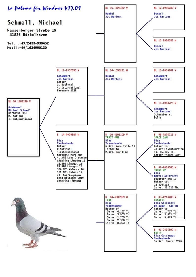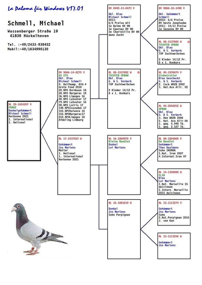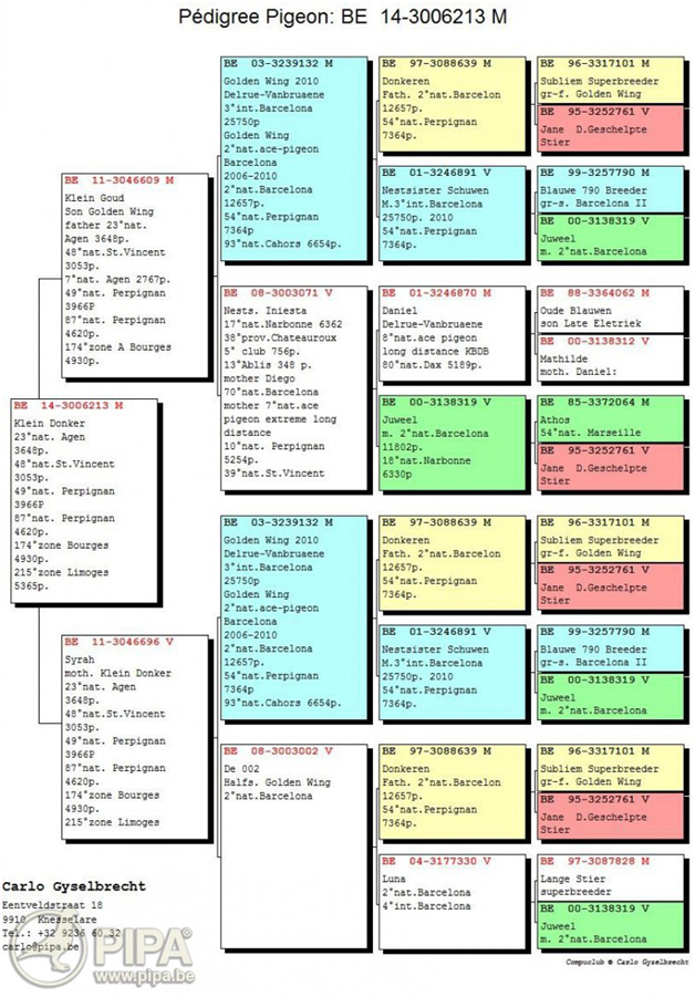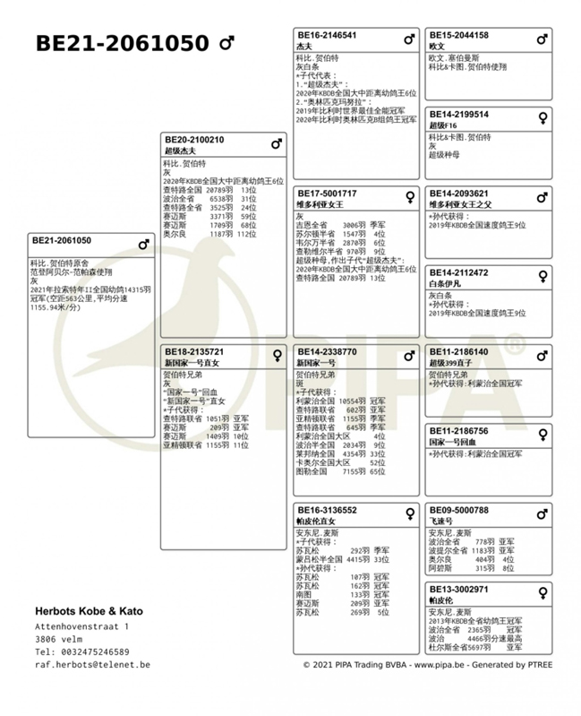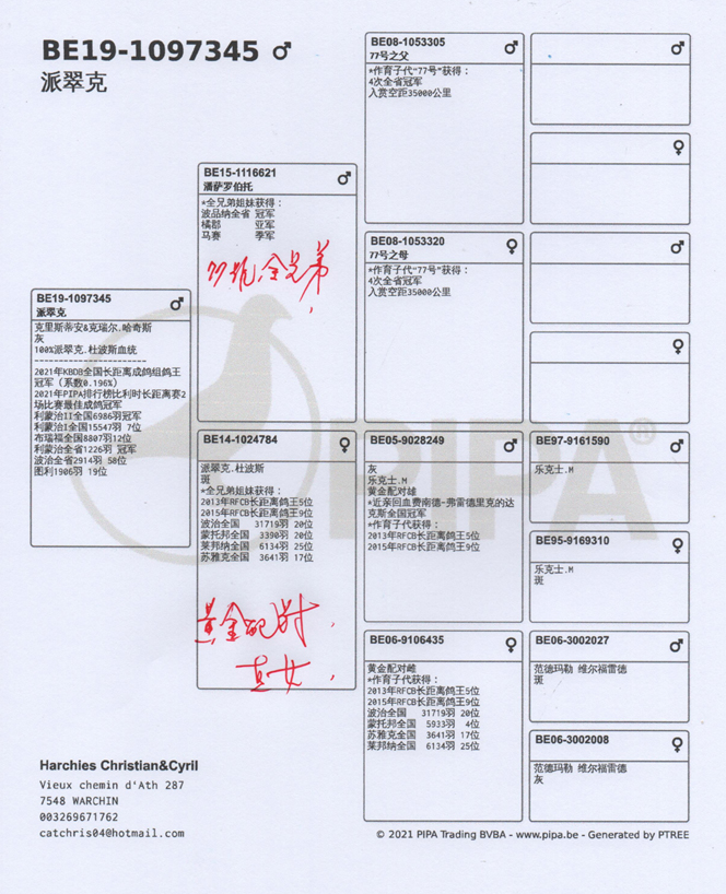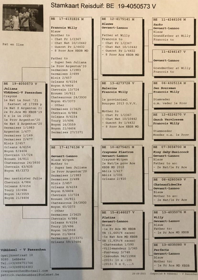 這羽賽鴿何其不凡!如果看過他的成績單,特別是他在3場長距離賽的成績,你肯定要驚歎他的表現。派翠克的名字來自他的作育者:古哈-哈姆克拉(Gaurain-Ramecroix)的派翠克.杜波斯(Patrick Dubois),這羽2歲灰雄鴿已經憑藉他在前兩場比賽利蒙治I和布瑞福的表現成為KBDB全國鴿王的有力競爭者。然後他又獲得利蒙治II全國6986羽冠軍(哈奇斯家族的第3項冠軍)。這也直接終結了關於KBDB全國長距離鴿王冠軍的一切懸念,“派翠克”成為2021年比利時全國最佳長距離賽鴿。
