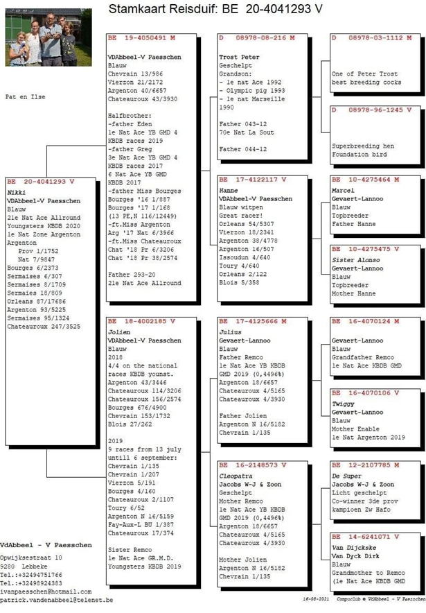 獲得比利時拉斯特年I I(La Souterraine II )全國成鴿組3.084羽冠軍及5位為范登阿貝爾-範帕森(Van den Abbeel-Van Paesschen)鴿舍,該舍冠軍鴿B19-4050573斑母是在8月28日(星期六)下午16時04分完成打鐘,空距為563.349公里,平均分速為1163.86米/分,此鴿同時也是比利時拉斯特年II交鴿總數17.399羽的總冠軍鴿。在幼鴿組14.315羽又以一羽B21-2061050灰公在下午16時07分完成打鐘,平均分速為1155.94 米/分獲得全國幼鴿組14.315羽總冠軍。此鴿舍表現相當優異,歷年來少見。