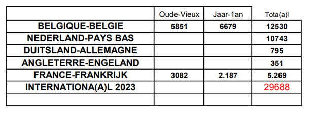 鴿數:總交數鴿29.688羽,今年首場設立成鴿組和一歲鴿組的國際賽。(含荷蘭10.743羽、比利時12.530羽、法國5.269羽、德國795羽、英國351羽),較去(2022)年33.796羽少了4.108羽。