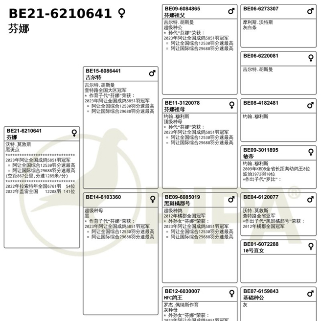 阿讓國際賽比利時成鴿組5.851羽冠軍為沃特.莫敦斯(Mertens Walter)鴿舍,該舍冠軍鴿B21-6210641班母是在7月1日(星期六)晚上1時29分,完成打鐘,空距為867.041公里,平均分速1285.52米/分,此鴿同時也是2023年阿讓國際賽交鴿總數29.688羽的總冠軍鴿。