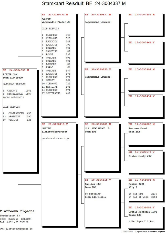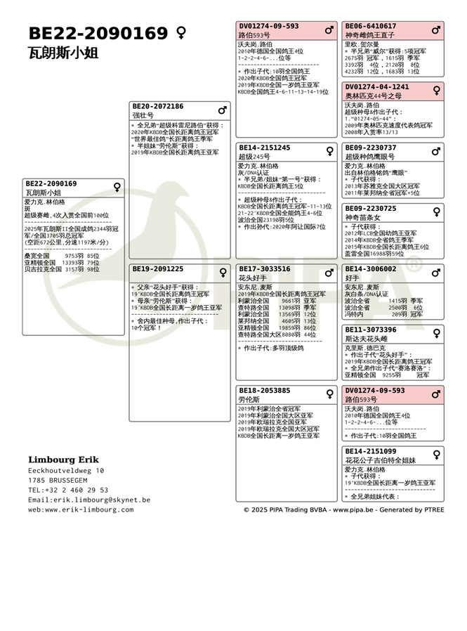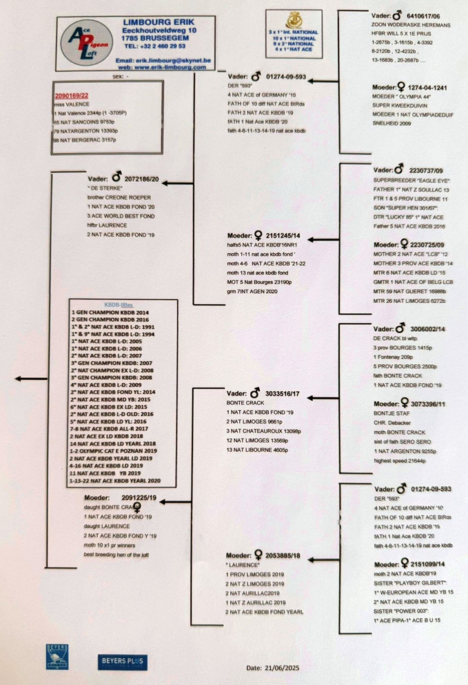 獲得2025年比利時瓦朗斯II國家賽"成鴿組"2.343羽全國冠軍是愛力克.林伯格(Limbourg Erik) 鴿舍,該舍冠軍鴿B22-2090169斑母是在6月21日(星期六)下午15時51分完成打鐘,空距為672.1公里,平均分速為1197.04米/分,同時也是集鴿總數3.704羽總冠軍鴿。