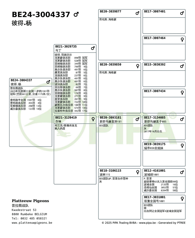 比利時瓦朗斯II國家賽"一歲鴿組"1.361羽全國冠軍是普拉圖戰隊 (Team Platteeuw) 鴿舍,該舍冠軍鴿B24-3004337灰公是在6月21日(星期六)下午15時52分39秒完成打鐘,空距為661.661公里,平均分速為1175.97米/分。