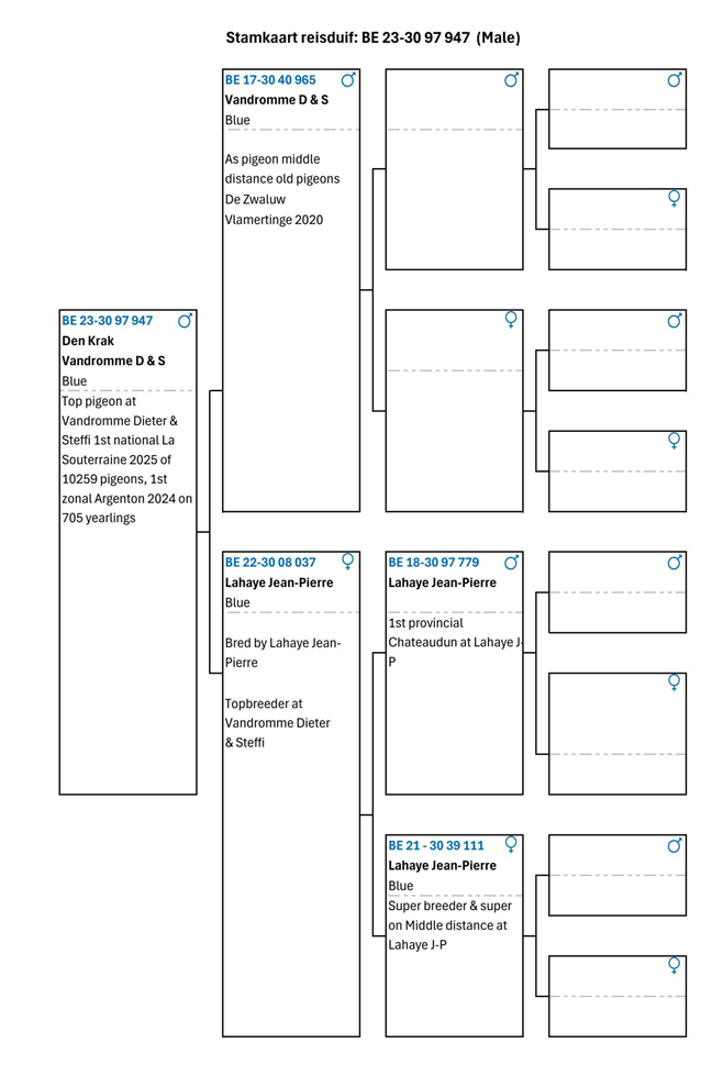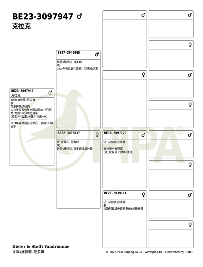 獲得比利時拉索特年全國成鴿組4.971羽冠軍為迪特&施特菲.範多姆(Vandromme Dieter & Steffi)鴿舍,該舍冠軍鴿B23-3097947灰公是在6月21日(星期六)晚上19時31分完成打鐘,空距為517.85公里,平均分速為1258.44米/分,此鴿同時也是交鴿總數10.259羽總冠軍鴿。