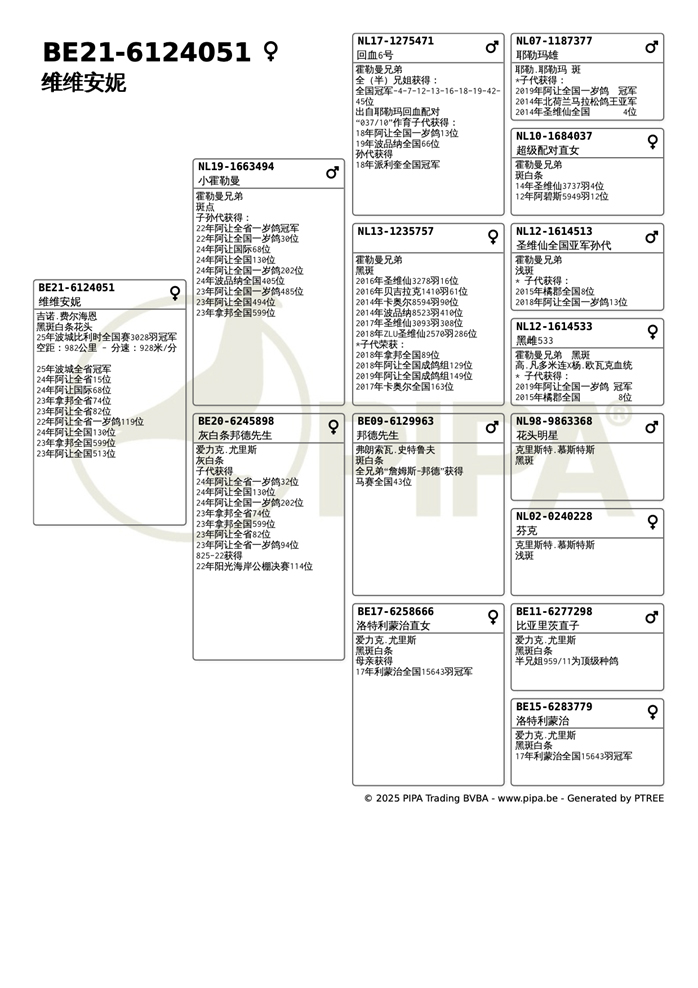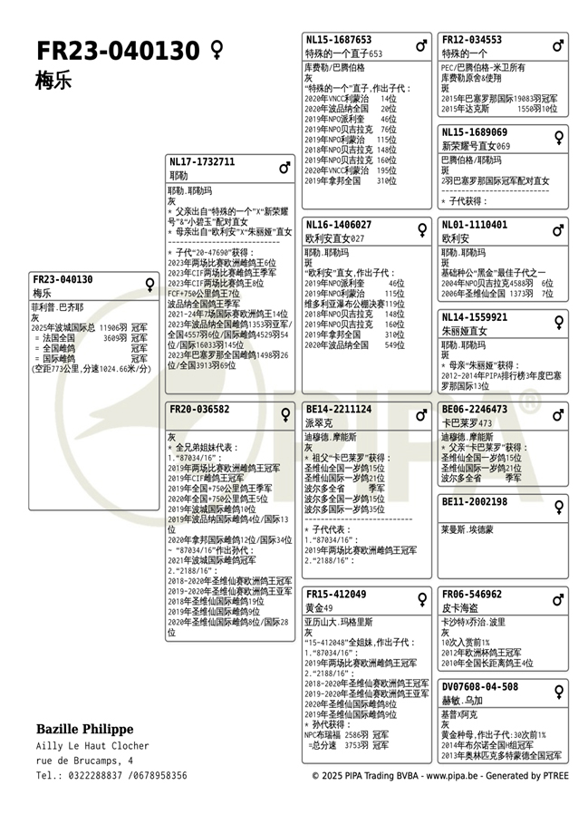2025年波城國際賽,獲得國際賽11.906羽總冠軍是菲力浦.巴齊耶(Bazille Philippe)鴿舍,該舍冠軍鴿FR23-040130灰母是在6月20日(星期五)晚上19時34分完成打鐘,空距為773.601公里,平均分速為1024.66米/分。