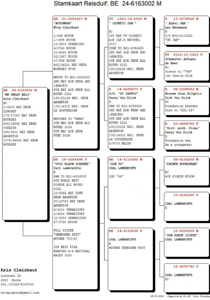 比利時一歲鴿4.689羽全國冠軍艾麗西亞&古瓦埃.克雷伯特( Cleirbaut Alicia & Goovae) 鴿舍,該舍冠軍鴿B24-6163002灰公在7月5日(星期六)下午15時01分完成打鐘,空距為663.532公里,平均分速為1321.86 米/分。