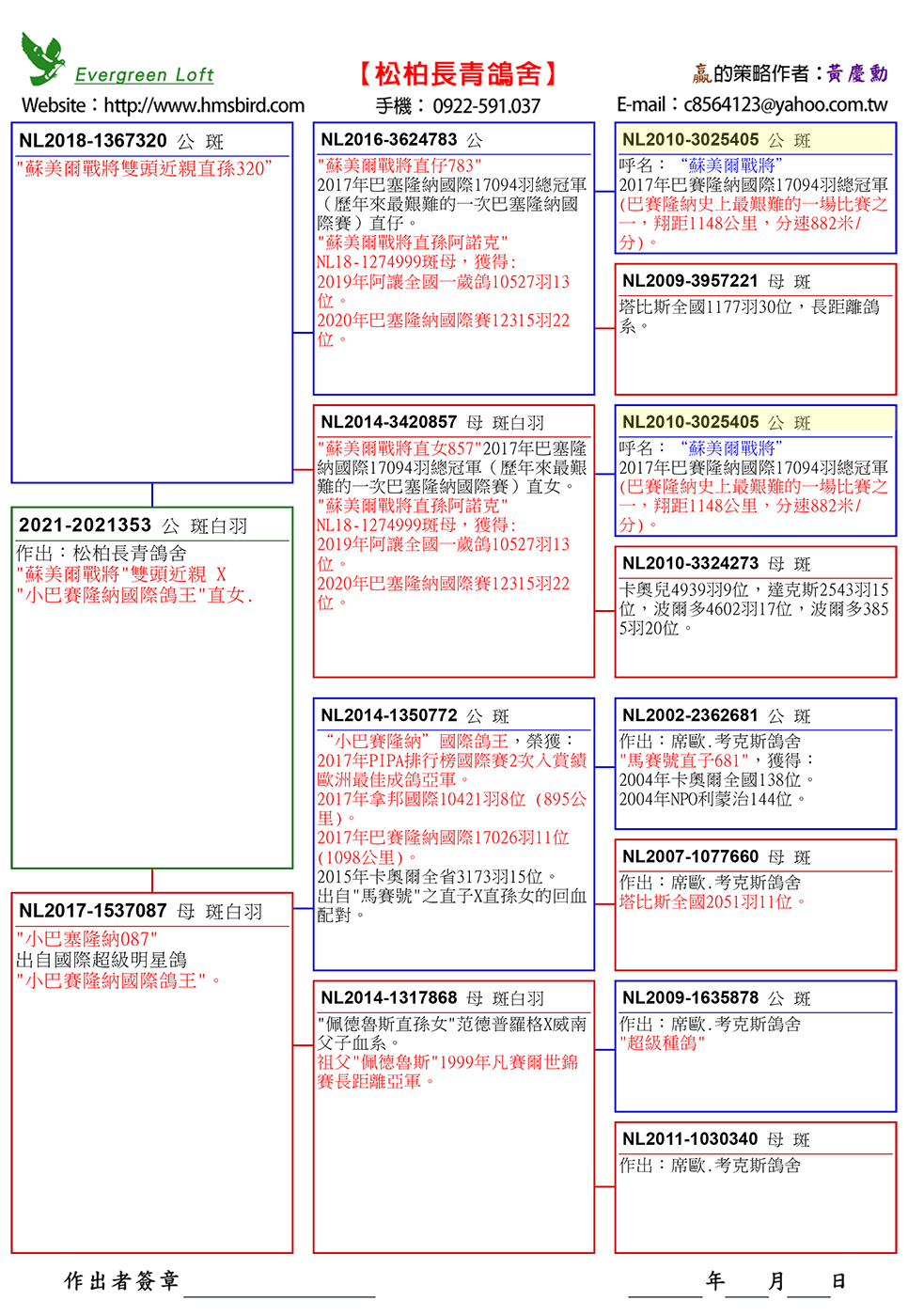 8、21-2021353斑白羽.公,特留種鴿,掛私環。 父鴿:NL2018-1367320班公,”蘇美爾戰將雙頭近親"直孫。 母鴿:NL17-1537087斑白羽.母,"小巴賽隆納國際鴿王" 2017年拿邦國際10.421羽8位 (895公里),2017年巴賽隆納國際17.026羽11位 (1.098公里)直女。