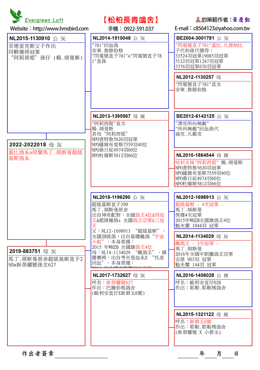 3、22-2022018灰母,特留種鴿,掛私環。 父鴿:NL15-1130910灰公,(安東.魯騰伯格”閃電直子781”回血X楊.胡曼斯”阿莉西亞直女”) 母鴿:19-883751灰母,(”超級基斯4次冠軍NL12-1698913”直子290)X(”新榮耀號627”)作出。