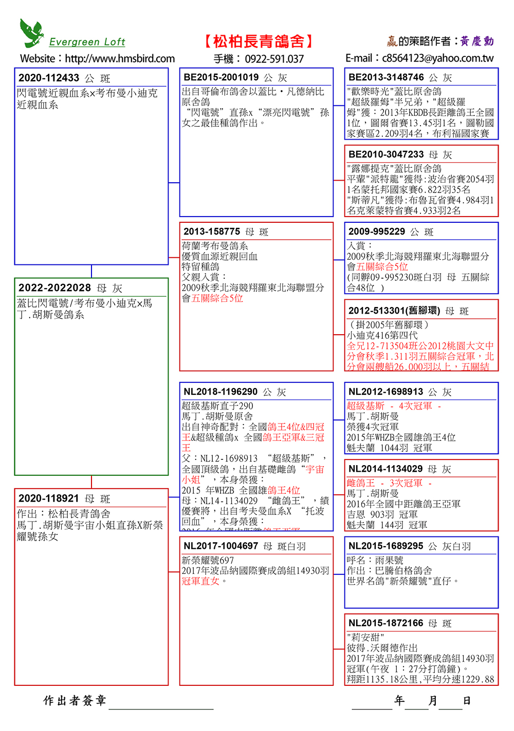 4、22-2022028灰母,特留種鴿,掛私環。 父鴿:20-112433斑公,考布曼小迪克鴿系X蓋比閃電、魯迪回血鴿系。 母鴿:20-118921斑母,(”超級基斯4次冠軍NL12-1698913”直子290)X(”新榮耀號697”)作出。