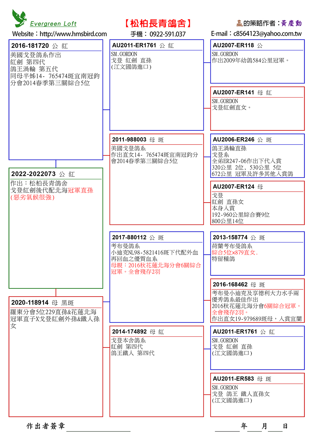2、22-2022073紅公,特留種鴿,掛私環。已售出 父鴿:16-181720紅公,戈登系,同母半姊14-765474宜蘭冠鈞分會2014春季第三關綜合5位 母鴿:20-118914斑母,羅東分會5位229直孫&花蓮北海冠軍直子X戈登紅劍外孫。