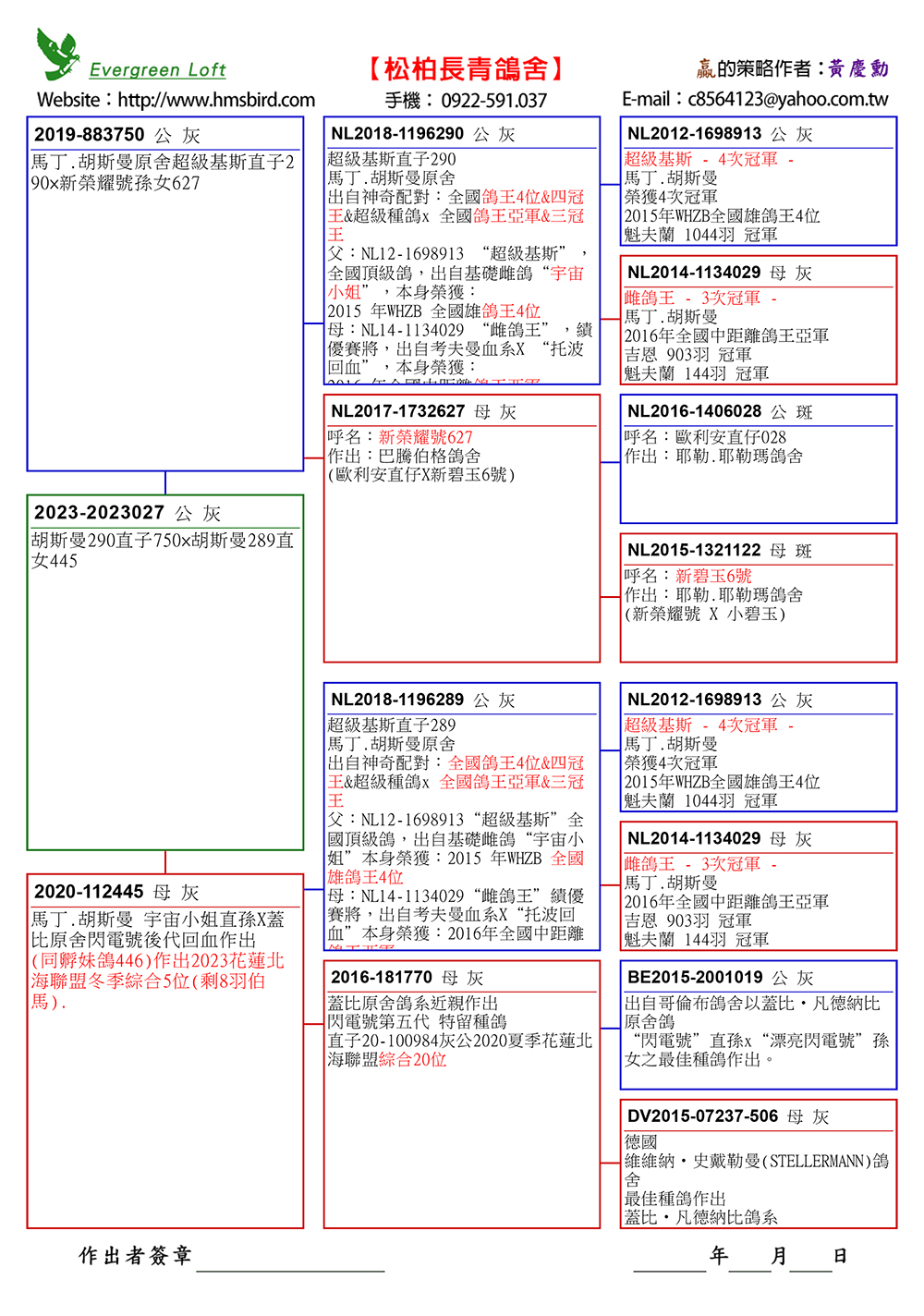 8、23-2023027灰公,特留種鴿,掛私環。 父鴿:19-883750灰公,(”超級基斯4次冠軍NL12-1698913”直子290)X(”新榮耀號627”)作出。 母鴿:20-112445灰母,同孵妹鴿446作出2023花蓮冬季四關殘存8羽之1綜合5位。(”超級基斯4次冠軍NL12-1698913”直子289)直女。