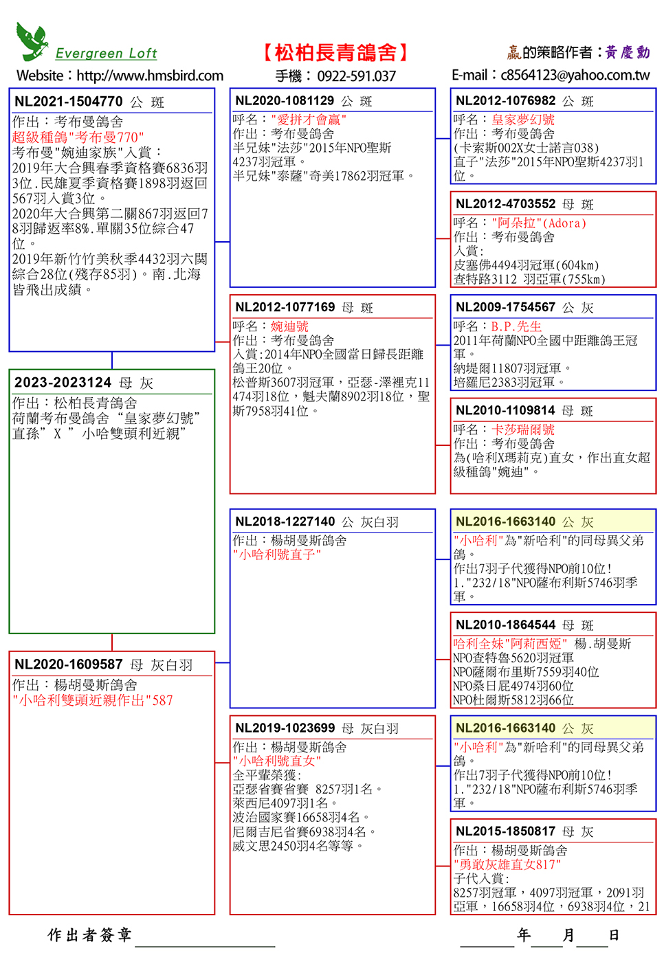 10、23-2023124灰.母,特留種鴿,掛私環 ( 速度鴿 )。已售出 父鴿:NL21-1504770班公,荷蘭考布曼鴿舍NL12-1076982斑公“皇家夢幻號”直孫。 母鴿:NL20-1609587灰白羽母,”小哈雙頭利近親”作出。