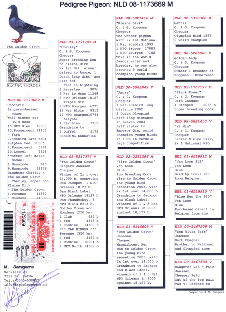 小迪克(Kleine Dirk)世界知名銘鴿1999Vredesduif鴿報全國鴿王1位1999 NPO特洛伊(529公里)全國17.884羽冠軍1999 NPO波治(700公里)全國7.165羽冠軍 |