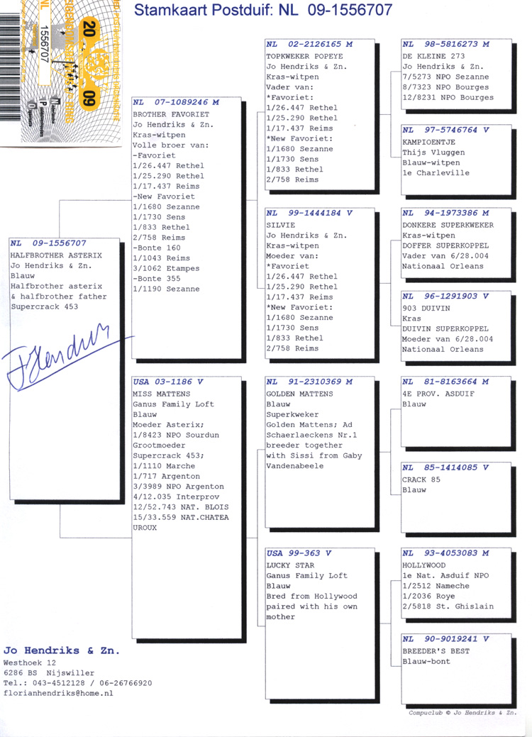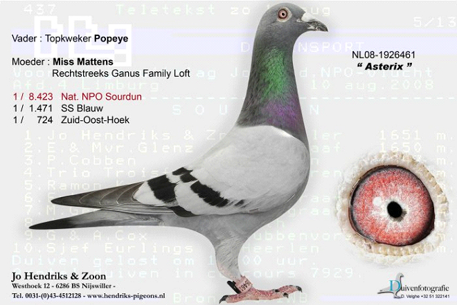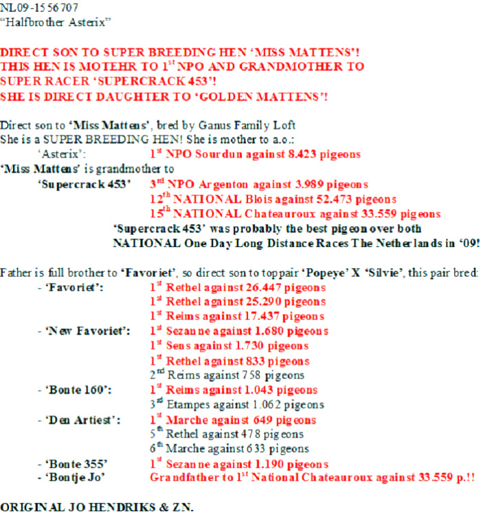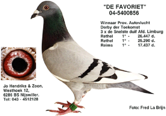 直仔NL04-5400856”最愛856”,入賞雷塔爾2萬羽以上2次冠軍及蕾姆斯17.437羽冠軍。3次超過1萬羽以上競翔冠軍。