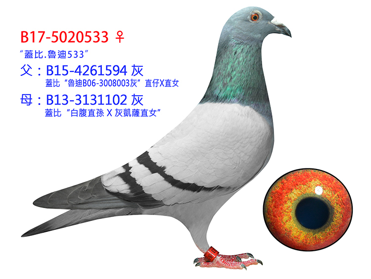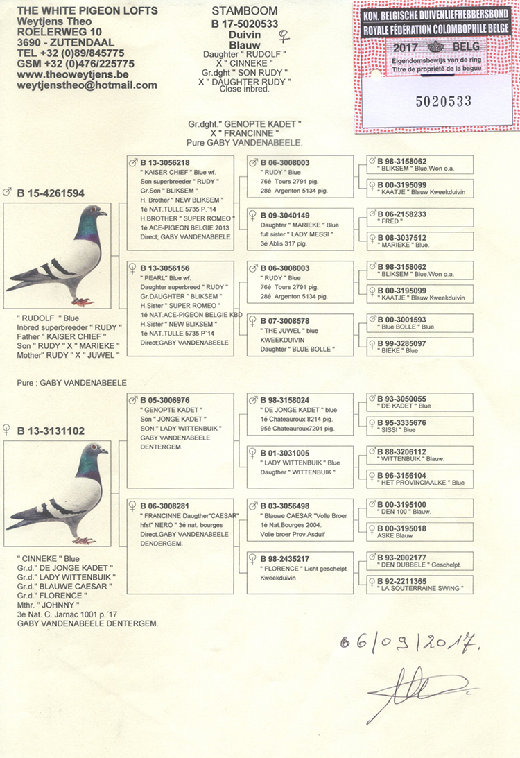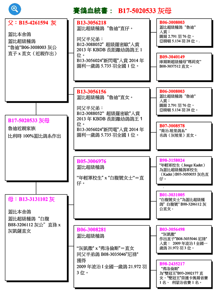 B17-5020533灰母”,比利時100%蓋比鴿系作出,”魯迪近親”家族 ●父鴿:B15-4261594灰公(蓋比本舍鴿),是蓋比超級種鴿“魯迪B06-3008003灰公” 直仔X直女。 祖父鴿:B13-3056218 蓋比超級種鴿“魯迪”直仔。 同父半兄弟: B12-3088052” 超級羅密歐”入賞2013年KBDB長距離幼鴿鴿王1位。B13-3056024”新閃電”入賞2014年圖利一歲鴿5.735羽全國1位。 祖母鴿:B13-3056156 蓋比超級種鴿“魯迪”直女。 同父半兄弟: B12-3088052” 超級羅密歐”入賞2013年KBDB長距離幼鴿鴿王1位。 B13-3056024”新閃電”入賞2014年圖利一歲鴿5.735羽全國1位。 ●母鴿:B13-3131102灰母(蓋比本舍鴿),是蓋比超級種鴿“白腹B88-3206112直孫”X”灰凱薩直女”。 外祖父鴿:B05-3006976 蓋比超級種鴿 ”年輕軍校生” x “白腹號女士”=直仔。 外祖母鴿:B06-3008281 蓋比超級種鴿 “灰凱撒“ x “弗洛倫斯”=直女 同父半弟鴿B08-3035046”尼祿“ 獲得 2009年波治I全國一歲鴿21.972羽3位。 ▼B17-5020533灰.母,純100%蓋比鴿系 血統書 ▼B17-5020533灰.母,純100%蓋比鴿系 中文血統書 ▼父鴿:B15-4261594 灰 蓋比超級種鴿